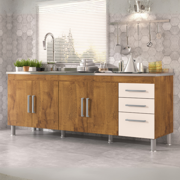 Este gabinete é produzido especialmente para pias de 2m, possui 3 gavetas com corrediças metálicas para melhor armazenar os itens de cozinha e conta com uma prateleira profunda completa no seu interior. Possui puxadores modernos e 6 pés para evitar empenamento da base, o gabi...