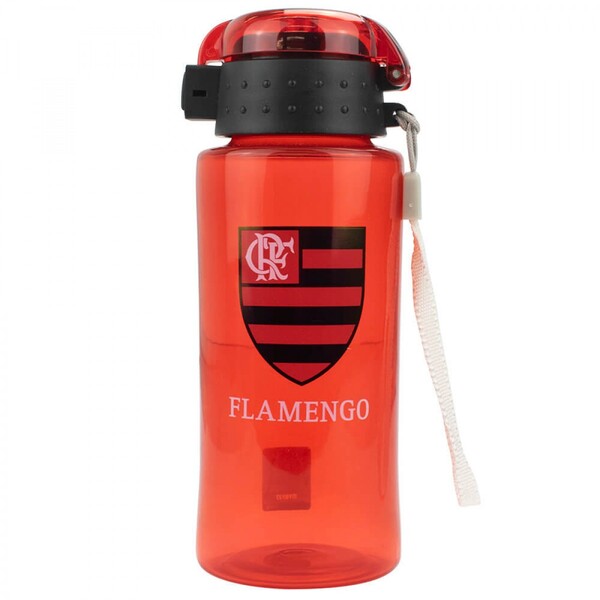 Garrafa de plástico gravada com brasão do flamengo. Capacidade para 450 ml com tampa de botão que abre e fecha. Material: plástico