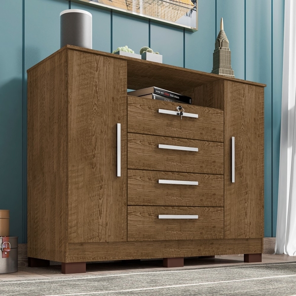 A cômoda 4 gavetas e portas é ideal para guardar suas roupas e sapatos. ela possui 4 gavetas e 2 portas, auxiliando em sua organização e praticidade. proporcionando um ambiente moderno e organizado. elaborada em mdp de 12/15 mm. informações do produto: altura: 99 cm lar...