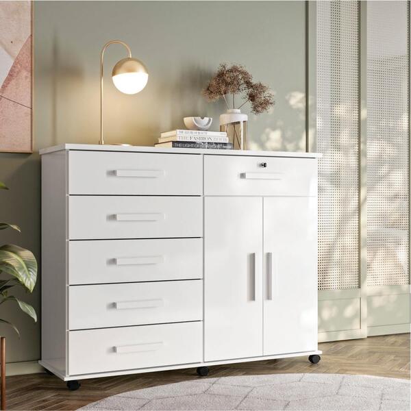 A cômoda tras um designer que facilita seu dia a dia. Rodízios gavetas com corrediças telescópicas puxadores em mdf tampo em mdp de 25mm gaveta com chave trava no fundo das gavetas informações do produto: altura: 115 cm largura: 126 cm profundidade: 45 cm cor:branco portas: sim (2) gavetas: sim, sendo uma com chave (6) prateleira: sim (2) pés: sim. Nichos: não espelho: não itens inclusos: 01 cômoda. Kit completo para montagem, manual detalhado de instruções para montagem. Garantia: 3 meses contra defeito de fabricação. Informações complementares: - fotos meramente ilustrativas do produto no ambiente. - os objetos que ambientam as fotos não acompanham o produto; - verificar descrição e tamanho do produto antes da compra. - avaliar a mercadoria no ato do recebimento e recusar em caso de divergência ou avarias. - mantenha as informações de contato e endereço de entrega atualizados para entrarmos em contato caso necessário. - limpar com flanela ou pano macio seco, não utilizar produtos abrasivos, desengordurantes, álcool ou solvente. Não expor o produto diretamente à luz solar e à umidade. * sugerimos a contratação de um montador profissional para a montagem do produto. Não nos responsabilizamos por avarias causadas no ato da montagem. * não nos responsabilizamos pela montagem e desmontagem do produto no ato da entrega e devolução, assim como os custos gerados nestas situações. * a transportadora entregará o produto no andar térreo do endereço de entrega. * não nos responsabilizamos por subir escadas, corredores e elevadores ou transporte por guincho em apartamentos