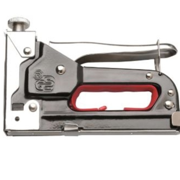 grampeador metálico profissional de tapeceiro, resistente e de alta qualidade, ideal para fixação de materiais diversos,como tecidos, plásticos e papeis em madeira, em trabalhos de tapeçaria, fixação de forros, cartazes, telas (mosquiteiros), serigrafia, vitrinismo, marcenaria, cartonagem, entre outros.