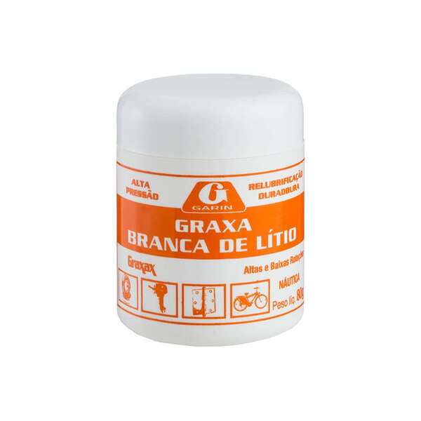 graxa branca pura de lítio - graxax uso profissional ou doméstico suaviza o movimento de partes móveis eliminando rangidos por longo período. Ideal para rolamentos de alta ou baixa rotação. tolera altas temperaturas resistente ao arrastro da água e repele a umidade evitando ferrugem. aplicações: - automóveis; - rolamentos; - corrente de bicicleta; - embarcações; - máquinas domésticas; - trilhos; - dobradiças etc. características: cor: branca forma: pasta temperatura de trabaho: até 150ºc ponto de gota: 186ºc composição: sabão de lítio óleo mineral aditivos e agentes protetivos anticorrosivos e antioxidantes pote com 80g