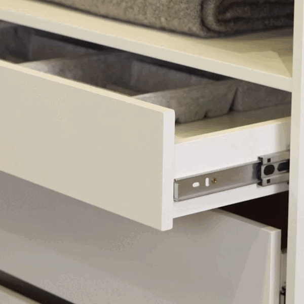 As gavetas foram desenvolvidas com sistema de amortecimento que garante um fechamento suave e controlado, evitando desgastes e prolongando a vida útil do seu guarda-roupa. É mais um detalhe pensado para unir praticidade, resistência e sofisticação.