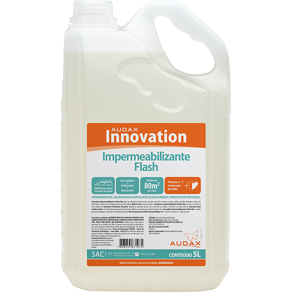 | Modo de Usar | Antes de aplicar o Innovation Impermeabilizante Flash remova as camadas de ceras antigas com Innovation Removedor Remotion seguindo as instruções de uso. Utilizar no mínimo 2 camadas de Innovation Base Seladora Sealer e com o piso seco, aplicar uma camada fina e uniforme do produto, deixar secar por 30 minutos. Repetir a operação por no mínimo mais 3 vezes e o brilho aparecerá rapidamente, podendo ser aplicado o uso de enceradeira High Speed. |