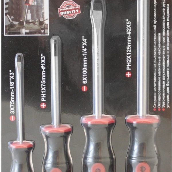 Jogo de chaves essencial para o dia a dia.   produzidas para maxima resistencia e durabilidade em  aço cromo vanadium.    cabo ergonômico.    jogo com:   duas chaves de fenda e duas chaves philips   fenda: ( largura da ponta x comprimento )  6mm x 100mm = (1/4"x4" polegada)  3mm x 75mm = (1/8"x3" polegada)   philips:    ph2 x 125mm (#2x5" polegada) ph1 x 75mm (#1x3" polegada)   1 blister com 4 chaves ( 2 fenda e 2 philips)