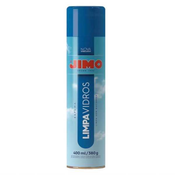 aplicações: jimo limpa-vidros aerossol remove sujeiras de diversasa superfícies, tais como vitrines, janelas, espelhos, para-brisas, acrílicos, cristais, etc. É prático por que a espuma adere na superfície e não escorre, o que facilita a sua remoção, deixando a superfície limpa e brilhante. Dispensa o enxágue e não ocasiona manchas.