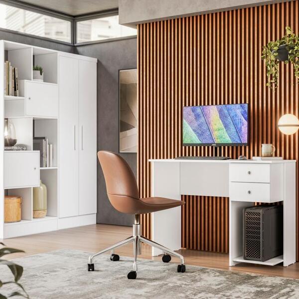 Este conjunto veio para trazer mais organização e elegância para seu ambiente de trabalho! A escrivaninha possui design compacto e ergonômico, prateleira elevada para o cpu e duas gavetas para melhor organizar seus objetos. Acompanha um armário multiuso, com 2 portas e 6 prat...