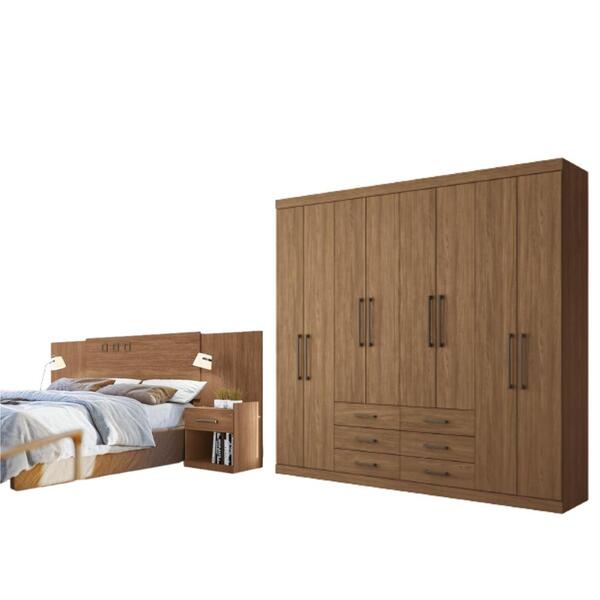 Este conjunto, possui todas as funcionalidades para atender a necessidade de espaço e organização do seu quarto! O guarda roupa conta com 8 portas e 6 amplas gavetas que deslizam suavemente sobre corrediças telescópicas. Além das 12 amplas prateleiras para acomodar as roupas que precisam ser dobradas, caixas, sapatos, decoração, etc. E os 4 cabideiros em alumínio para pendurar as roupas com organização. A cabeceirapossui duas mesas de cabeceira, com gavetas que deslizam em corrediças telescópicas, que são perfeitas para apoiar pequenos objetos como livros, celulares, etc. Sua estrutura regulável, permite que ela seja utilizada com colchões de casal de 138 e 158cm de largura. Os detalhes na cabeceira e nos puxadores em abs completam o design do produto! Dimensões do guarda roupa: altura: 217,6 cm largura: 238,8 cm profundidade: 46,3 cm informações do guarda roupa: cor:jatobá material principal: mdp portas com dobradiças metálicas puxadores de abs gavetas com corrediças telescópicas cabideiros em alumínio amplo maleiro portas: sim (8) gavetas: sim (6) cabideiros: sim (4) prateleiras: sim (12) dimensões do cabeceira: altura: 104,5 cm largura: 234 / 254 cm profundidade: 38,7 cm informações do cabeceira: cor: jatobá material principal: mdp para colchões box de 138 e 158cm detalhes e puxadores em abs gavetas com corrediças telescópicas gavetas: sim (2) itens inclusos: 01 guarda roupa 01 cabeceira manual de montagem kit completo para montagem e manual de instruções garantia: 3 meses contra defeito de fabricação informações adicionais: - fotos meramente ilustrativas do produto no ambiente. - os objetos que ambientam as fotos não acompanham o produto; - verificar descrição e tamanho do produto antes da compra. - avaliar a mercadoria no ato do recebimento e recusar em caso de divergência ou avarias. - mantenha as informações de contato e endereço de entrega atualizados para entrarmos em contato caso necessário. - limpar com flanela ou pano macio seco, não utilizar produtos abrasivos, desengordurantes, álcool ou solvente. Não expor o produto diretamente à luz solar e à umidade. * sugerimos a contratação de um montador profissional para a montagem do produto. Não nos responsabilizamos por avarias causadas no ato da montagem. * não nos responsabilizamos pela montagem e desmontagem do produto no ato da entrega e devolução, assim como os custos gerados nestas situações. * a transportadora entregará o produto no andar térreo do endereço de entrega. * não nos responsabilizamos por subir escadas, corredores e elevadores ou transporte por guincho em apartamentos.