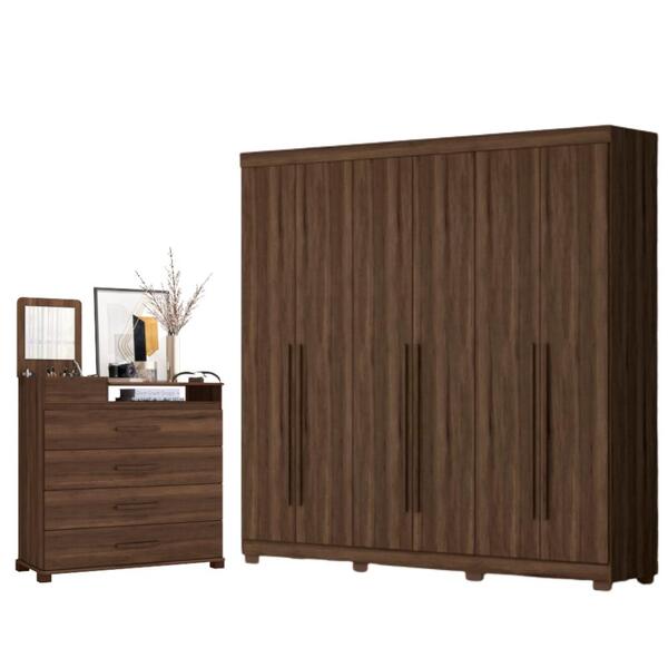 O conjunto veio para trazer sofisticação para seu ambiente. Guarda roupa em mdp pintura uv gavetas com corrediças telescópicas puxadores em mdf revestido pés inclusos cabideiros em aluminio portas e laterais de 15 mm. Interna 100% a cor do produto comoda porta, tampo tv e base de mdf usinado com pintura de borda. 4 gavetas com corrediças telescópicas e com reforço estrutural no fundo puxadores de mdf revestidos e pés inclusos espaço para tv de até 22" espelho incluso 0,29x0,29 m dimensões do guarda roupa: altura: 235 cm largura: 241 cm comprimento: 51 cm dimensões da comoda: altura: 109 cm largura: 106 cm comprimento:45cm informações do guarda roupa: cor:cedro material principal: mdp acompanha espelho: não cabideiro: sim, em aluminio (3) gavetas: sim , com corrediças telescópicas (4) prateleiras: sim (4) nichos: sim (8) portas: sim (6) pés: sim, em abs (8) tipo de pintura: uv informações da comoda: cor:cedro gavetas: sim (4) portas: sim, basculante (1) prateleiras: não possui espelho: sim nichos: sim (1) material principal: mdp/mdf itens inclusos: - 01 guarda roupa e 01 cômoda. - kit completo para montagem, manual detalhado de instruções para montagem. Garantia: 3 meses contra defeito de fabricação. Informações adicionais: - fotos meramente ilustrativas do produto no ambiente. - os objetos que ambientam as fotos não acompanham o produto; - verificar descrição e tamanho do produto antes da compra. - avaliar a mercadoria no ato do recebimento e recusar em caso de divergência ou avarias. - limpar com flanela ou pano macio seco, não utilizar produtos abrasivos, desengordurantes, álcool ou solvente. Não expor o produto diretamente à luz solar e à umidade. * sugerimos a contratação de um montador profissional para a montagem do produto. Não nos responsabilizamos por avarias causadas no ato da montagem. * não nos responsabilizamos pela montagem e desmontagem do produto, assim como os custos gerados nestas situações. * não nos responsabilizamos por subir escadas, corredores e elevadores ou transporte por guincho em apartamentos.