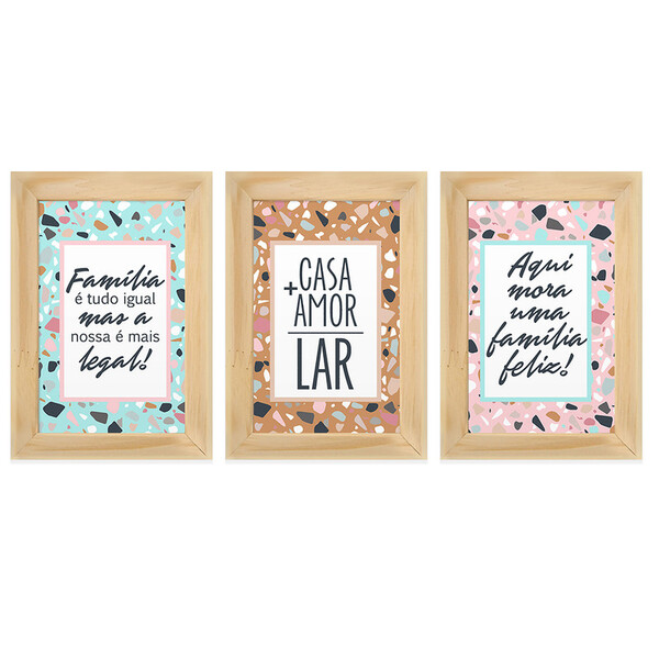 Características gerais do produto:     itens inclusos: 03 quadros com 13x18cm cada um + fita dupla face   dimensões em conjunto: 41x18cm (incluindo 2cm de espaçamento)   material estampa: quadro em mdf 3mm; não possui vidro   moldura: feita com madeira reflorestada; moldura em madeira pinus natural; espessura aproximada: 1cm   uma composição simples, elegante e com um charme único: o kit de 3 quadros com moldura é o tipo de decoração que faz a diferença em qualquer lugar. para aquele cantinho especial na sua sala, quarto, cozinha, e até mesmo para presentear alguém querido, o kit 3 é a opção ideal.   produto direto de fábrica, produzido com muito orgulho no brasil -material premium: produtos de matéria-prima nobre com uso de madeiras tratadas e certificadas. -tecnologia de impressão: impressão u.v. Diretamente na madeira, garantindo qualidade e durabilidade muito maior em relação ao comum papel couchê ou adesivo. - exclusividade: nosso time de criação desenvolve artes e coleções com base nas últimas tendências da decoração, que já são destaques no brasil e no mundo   fixação:  - os quadros e composições de até 30x40cm acompanham fita dupla face para auxiliar na fixação, sem necessidade de perfurar a parede. Basta fazer a limpeza do local a ser instalado e aplicar a fita em superfície plana e lisa. - quadros e composições com tamanho 40x60cm e acima são enviados com penduradores para fixação na parede. - as placas de porta e placas indicativas acompanham o cordão de sisal para auxiliar ao pendurar. -  lembre-se de seguir os processos recomendados de instalação, pois são necessários para garantir a segurança e aumentar a durabilidade.   segurança garantida: - 30 dias de garantia contra defeitos de fábrica. - siga sempre as orientações de instalação. imagens ilustrativas: as fotos apresentadas são ilustrativas e as tonalidades do produto impresso final podem ter pequenas variações em relação à imagem apresentada devido aos fatores de produção.   conservação: -  faça a limpeza com um pano seco e macio e não utilize nenhum produto de limpeza. -  recomendamos que você instale nossos quadros em um ambiente interno. -  evite expor em lugares úmidos ou com constante luz do sol, pois interfere diretamente na durabilidade. -  não instale fitas dupla face em superfícies com texturas para evitar riscos de queda.   quem somos: a hugart é uma indústria de quadros e artigos para decoração, presente em alguns dos maiores home centers do brasil e em mais de 1.000 lojas! acreditamos que você merece o melhor ao decorar sua casa ou ao presentear alguém querido. Nossas artes são exclusivas e todos os produtos são feitos com madeira reflorestada.   se tiver dúvidas escreva aqui nos comentários, nosso time fica feliz em responder!