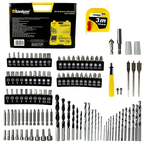 Descrição do produtos:kit de brocas 110 peças com maleta - titanium platinaintrodução: o kit de brocas 110 peças com maleta - titanium platina é a solução completa para quem busca praticidade e versatilidade em trabalhos de perfuração. Com uma ampla variedade de brocas e ponteiras, este kit é ideal para uso em madeira, concreto e metal, atendendo tanto profissionais quanto entusiastas do "faça você mesmo".indicação de uso: perfeito para uso em oficinas, indústrias, construção civil e projetos de bricolagem. Ideal para quem necessita de um conjunto completo e confiável de brocas e ponteiras para diversas aplicações.conteúdo do kit:13 ponteiras de 50mm: ph1, ph2, ph3, pz1, pz2, pz3, t10, t20, t30, (-) 4, 5, 6, 710 ponteiras tipo soquete: 4, 5, 6, 7, 8, 9, 10, 11, 12, e 13 mm3 escareadores1 suporte magnético para ponteiras1 trena: 3m1 chave catraca para ponteiras2 guias para ponteiras13 brocas hss: 1.5, 2, 2.5, 3, 3.2, 3.5, 4, 4.5, 4.8, 5, 5.5, 6, 6.5 mm6 brocas para madeira: 4, 5, 6, 7, 8, 10 mm3 brocas para madeira ponta chata: 13, 16, 19 mm6 brocas para concreto: 4, 5, 6, 7, 8, 10 mm50 ponteiras de 25mm, sendo:(-) 3-3-3-4-4-4-5-5-5-5.5ph1, ph1, ph1, ph1, ph2, ph2, ph2, ph2, ph3, ph3(-) 6,6,6,6; s1; s2; s3; h4; h5; h6t10, t10, t15, t20, t25, t27, t30, t40, (-)7pz1, pz1, pz1, pz1, pz2, pz2, pz2, pz2, pz3, pz3acessório incluso:1 maleta para armazenamentocaracterísticas principais:alta resistência: fabricado em materiais de alta qualidade para garantir durabilidade e eficiênciaversatilidade: conjunto completo para atender a diversas necessidades de perfuraçãoprecisão: brocas de diferentes tamanhos e tipos para trabalhos detalhados e específicosorganização: maleta inclusa para facilitar o armazenamento e transporte das peçasbenefícios:desempenho superior: proporciona alta eficiência em tarefas de perfuração em diferentes materiaisdurabilidade: fabricado com materiais de alta qualidade para garantir uma longa vida útilversatilidade: kit completo para diversas aplicações de perfuração e fixaçãopraticidade: fácil de usar e transportar, ideal para profissionais e amadoresespecificações técnicas:quantidade de peças: 110acessório: 1 maleta para armazenamentoeste kit de brocas é a escolha certa para quem busca qualidade, eficiência e versatilidade em suas tarefas de perfuração. Adquira já o seu e melhore a qualidade do seu trabalho com confiança e performance superior. Medidas da embalagem:30cmcx5,5cmlx20cmapeso bruto:1,670 peso líquido:1,600 código de barras:7908200021715 ------------------------------------------------------------------------------------------------como calcular seu frete------------------------------------------------------------------------------------------------- trabalhamos com cálculo de frete automático gerado junto à plataforma, pedimos que procure na página do anúncio a opção de cálculo do frete para ter o valor correspondente ao seu cep. -------------------------------------------------------------------------------------------------dúvidas frequentes------------------------------------------------------------------------------------------------- 1. O produto é novo?sim, o produto anunciado é novo. 2. O produto está disponível em estoque?sim, disponível para envio imediato após a liberação de sua compra. 3. O produto acompanha nota fiscal?sim. Ela também estará disponível no campo de mensagens de sua compra assim que ela for emitida. Verifique sempre os seus dados cadastrais antes de efetuar a compra. 4. Qual tempo de envio e formas de entrega?os pedidos são despachados no mesmo dia da compra, desde que, liberados pela plataforma até às 13:00hs. Compras efetuadas após este horário serão enviadas no próximo dia útil. 5. Como são realizadas as entregas?r: as entregas poderão ser realizadas via correios ou transportadoras. 6. Todos os itens das fotos acompanham o produto?há anúncios em que aparece o acessório para fins de entendimento do uso. 7. Você ainda tem dúvidas?sobre sua dúvida entre pelo campo de perguntas e nós responderemos com as informações necessárias o mais breve possível. Somente clique em comprar após a plena certeza em honrar a compra e concordar com as condições descritas. Agradecemos pela preferência!!! Cod.inter.kit