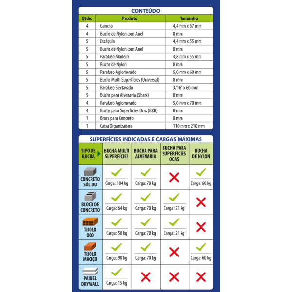 | Observações sobre a Capacidade de Peso | Bucha 08mm: 60 kg / bucha 08mm: 60 kg / bucha 08 mm: 21 kg / Bucha 08mm 70 kg / Bucha 08 mm (concreto solido 104 kg, bloco de concreto 64 kg, tijolo maciço 90 kg, oco 50 kg, dywall 15 kg) |