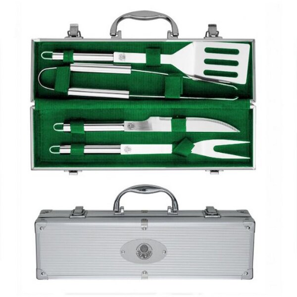 Produto licenciado   kit churrasco 4 peças em maleta de alumínio com relevo.   descrição: - possui: espátula, pegador, garfo e faca em inox (todas peças possuem proteção plástica) detalhes em metal nas bordas da maleta, duas dobradiças na parte inferior, uma alça e duas presi...