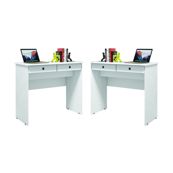 mesa para estudo ou trabalho, para casa ou escritório. móvel de design diferenciado e compacto, ideal para proporcionar ao seu ambiente muito mais funcionalidade e organização, já que dá para usar como escrivaninha, colocar seu notebook e livros. elaborado mdp/mdf de 12mm; corrediças metalicas. medidas do produto: altura: 77 cm largura: 90 cm comprimento: 45 cm informações do produto: cor: branco gamer: não possui gavtetas: sim (2) material:mdp/mdf de 12mm itens inclusos: 02 escrivaninha. kit completo para montagem, manual detalhado de instruções para montagem.