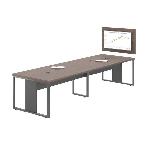 Conjunto de mesa de reunião e painel a mesatem tampo em mdp bp 40 mm acabamento de bordas em abs de 1mm caixas para tomadas de energia e usb acima do tampo 40 mm compartimento central abaixo do tampo 40 mm para conexões e passagemde fios e cabos de energia, telefonia e inform...