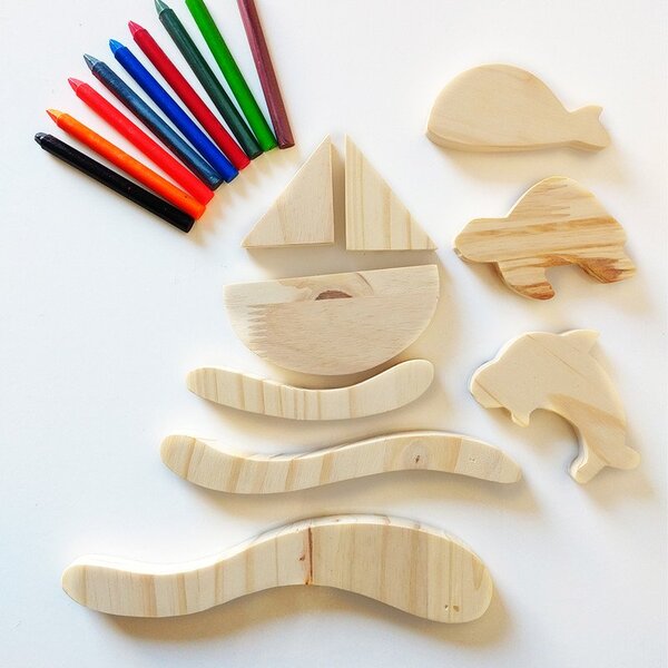 Kit fundo do mar - kit fundo do mar - empilhar e colorir brinquedo artesanal feito em madeira pinus, composto de: -3 ondas do mar, -3 peças que formam um barquinho, -3 peixes, -1 kit giz de cera, -1 saquinho de tecido. dimensão: onda: 23 cm aproximadamente. Peixes: 10c...