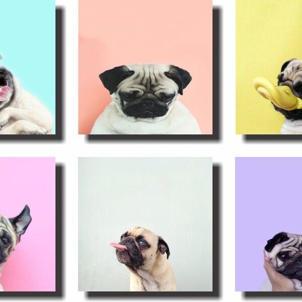 Quadrinhos pug engraçado      impresso em tecido  canvas  e montado em bastidor de madeira. com grampos por trás do quadro para melhor acabamento. imagens em alta resolução para um resultado satisfatório ao cliente.   6 peças dimensão  60 cm altura por...