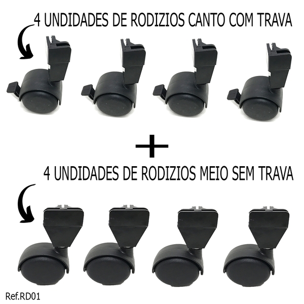 Kit contendo 4 rodízios de meio e 4 de canto - conectivos de canto acompanham trava que possibilitam uma maior segurança e estabilidade para o seu móvel- ideal para você que deseja personalizar seu balcão.