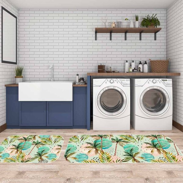 Kit tapete lavanderia palm trees único - características gerais do produto: cuidados: lavar a mão, nâo alvejar, não passar, secar à sombra, secar sem torcer, não usar secadora tamanho dos tapetes: - 1 tapete 40x80cm e 1 tapete 40x60cm tema: lavanderia tecido: 100%...