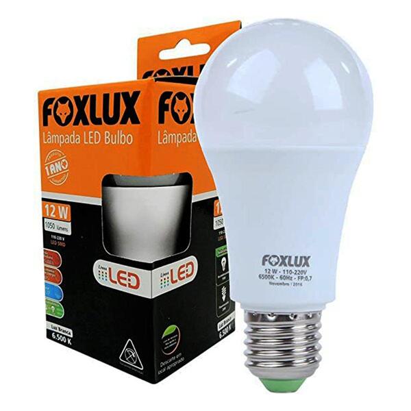 Lâmpada led bulbo 12w 6500k - foxlux características: potência: 12w soquete: e27 (soquete padrão) cor: branco frio (6500k) tensão: bivolt 100-240v fluxo luminoso: 1080 lúmens ângulo de abertura: 180 frequência: 60hz vida média: 25.000h lâmpada incandescente equivalente: 75...