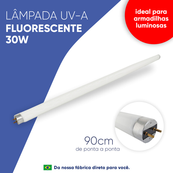 Funcionamento a luz uv-a emite ondas de 365 nanômetros tornando-a ideal e diferencial para atração dos insetos que são fotossensíveis a este tipo de luz. Esta não é visível ao olho humano mas é muito atrativa para a maioria das moscas e outros. instalação encaixe a lâmpada no soquete da armadilha e gire sentido anti-horário até escutar o clique.   recomendações de uso: a substituição se faz necessária mesmo se a lâmpada estiver funcionando aparentemente normal pois mesmo que ela esteja acesa o desgaste da camada de fósforo no interior da lâmpada pode reduzir em até 50% a atratividade aos insetos.   quando substituir as lâmpadas e placas adesivas: substitua as lâmpadas uv-a e o petg (protetor de lâmpadas) a cada 10 meses ou 8.000 horas de uso.   informações técnicas - dimensões: c 90cm x diâmetro 25mm. - peso: 1kg - voltagem: bivolt - base (soquete): g13 - potência: 30 watts   garantia lâmpadas 3 meses (90 dias).