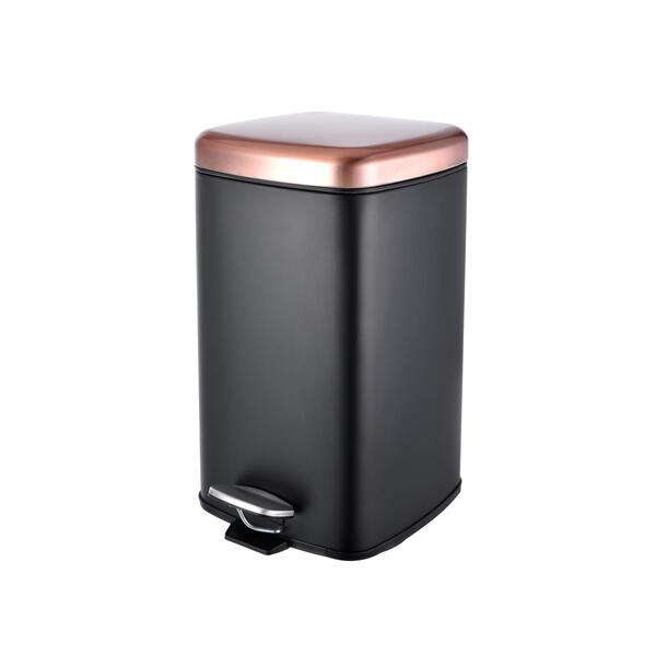 Revestida na cor preta com a tampa na cor bronze, a lixeira quadrada contém pedal que facilita a abertura sem precisar do contato das mãos.