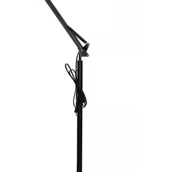 Dados técnicos: Soquete: E-27 Material: Metal Voltagem: Bivolt Cúpula: 15cm de diâmetro x 15cm de altura Base: 25cm de diâmetro Altura total: 1,90m Com haste articulável Material: Metal e ABS Peso aproximado: 5.4kg Cor: Preto Garantia: 3 Meses