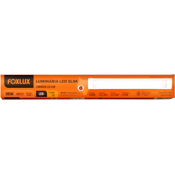 Luminária led slim 18w 3000k bivolta luminária led slim é ideal para a substituição da lâmpada tubular fluorescente. Tem maior luminosidade e vida útil, além de não esquentar. Possui um design moderno e acompanha parafusos e base de fixação. Vida média de aproximadamente 25.000h.características técnicas:potência: 18 w;lúmens: 1.000;luz quente;80% de economia de energia;120º de ângulo de abertura;luz branca;bivolt.