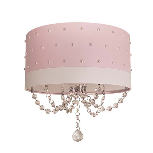 Luminária plafon pérolas 30x15 modelo de sobrepor; ideal para compor a decoração do quarto, proporcionando uma boa iluminação; cúpula produzida em psai de alto impacto com acabamento em tecido de algodão na tonalidade rosa bebê e detalhes de fita em laminado pet flexível com meia pérolas alocadas por toda a extremidade da cúpula. Capacidade para 2 lâmpadas rosca comum led e-27 12w (não inclusas) fechamento total correntes com cristais k9 e bola 30mm k9; embalagem: caixa de papelão