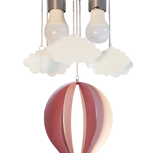 Luminária indicada para uso interno.  medidas com a peça montada: 20cm largura x 20cm comprimento x 56cm altura chapa em alumínio (20cm de diâmetro) com pintura branca pingentes com nuvens (plásticas) e balão (acrílico pintado) / cestinha em palha natural. Cores: tons de rosa claro e rosa escuro correntinhas de sustentação em metal niquelado. Medidas: 20cm de diâmetro por 56cm de altura.  capacidade para duas lâmpadas (led com rosca comum e-27) - não incusas.  voltagem: 110 / 220v (bivolt)  pode ser instalada em teto de alvenaria/ gesso/ pvc/ madeira