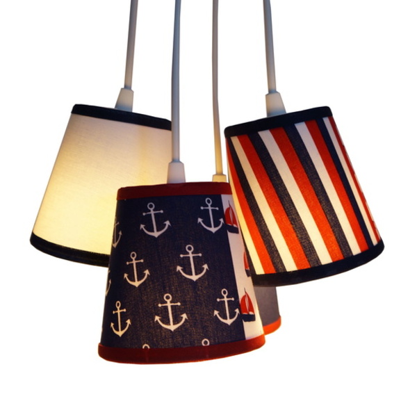 Lustre pendente com 4 cúpulas revestidas com tecidos nas cores azul marinho, branco e vermelho - motivo marinheiro. Dimensões de cada cúpula: 13 cm de altura, 13 cm de diâmetro inferior e 8 cm de diâmetro superior. o comprimento total da luminária é ajustável no momento da instalação. Cada cabo tem 90 cm de comprimento. Usar lâmpadas fluorescentes ou led (incandescente até 25w). Canopla e cabos na cor branca. ​bivolt