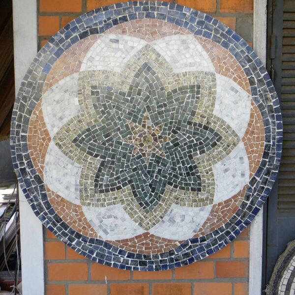 Mandala de pendurar na parede mandala feita baseado nos desenhos decorativos indianos é uma interpretação da flor de lótus vista de cima. pedras utilizadas: mármore italiano rosso verona granito amarelo ornamental tons de verde labrador mármore branco espirito santo e granito azul bahia. Os tons podem variar conforme o lote das pedras. significado do modelo esta mandala é como uma imagem vista de cima de uma flor de lótus. Ela também simboliza o sol que emite luz em todas as direções. A forma da mandala se assemelha à geometria das sementes de girassol que se entrelaçam de maneira harmoniosa e são usadas na decoração da basílica de san marco em veneza lembrando novamente o sol. a mandala tem a forma do número 8 e está relacionada aos resultados da energia que colocamos como uma representação simbólica da colheita que vem depois do plantio. Ela traz sensação de harmonia e equilíbrio. especificações técnicas do mosaico: feito com pedras - mármores e granitos de todo o brasil e importados da europa e ásia - para obter todas as cores desejadas em pedras naturais; borda com acabamento em rejunte; vêm previamente colada sobre uma chapa cimentícia leve. Vem com um gancho em inox atrás para pendurar na parede. Já vem incluído bucha 8 e parafuso/escápula 5mmx80mm para pendurar. resistência e durabilidade em área interna e externa; espessura de 20mm; mosaico feito integralmente à mão com técnica do mosaico romano;   dúvidas frequentes:         tem riscos de quedas?  os mosaicos de até 100 cm não apresentam riscos de quedas. No entanto se você desejar uma maior segurança recomendamos colocar várias "escapula gancho zincado" ou pedaços de cantoneira metálica na parte inferior da peça para fornecer apoio. posso fazer em outro tamanho? Para tamanhos que não estejam disponíveis no site você pode entrar em contato conosco pois realizamos encomendas sob medida. Se o mosaico tiver mais de 100cm por questões de segurança ele deve ser colado diretamente na parede. Neste caso o mosaico vem colado sobre uma tela e deve ser colado com cimento cola e rejuntado conforme o manual de colocação. como é transportado? O mosaico é protegido em plástico bolha e é colocado uma espuma ao longo de toda a borda do mosaico e por fim é embalado em uma caixa de papelão. Em caso de tamanhos maiores também é colocado em uma caixa de madeira. A transportadora coleta aqui em nosso ateliê e entrega seguro no seu endereço. quanto tempo leva para confeccionar a peça? Nosso prazo de confecção é de até 31 dias úteis. No entanto se você tiver urgência por favor entre em contato conosco para verificar a possibilidade de produzirmos em um prazo menor. é possível mudar as cores e materiais? Recebemos frequentemente essa pergunta no entanto não recomendamos fazer alterações nas cores e materiais padrão. Fazer mudanças pode resultar em um resultado que pode não atender às suas expectativas.