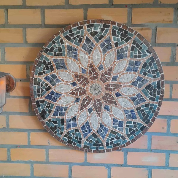 Mandala de pendurar na parede a vitral árabe é inspirada diretamente nas decorações do mundo árabe retirado de desenhos dos palácios reais ela traz o encanto e o charme do elaborado mundo das artes árabes.  pedras utilizadas: mármore italiano rosso verona granito vermelho brasília granito amarelo ornamental tons de verde ubatuba e verde labrador e verde forest granito branco espirito santo e granito azul bahia. Os tons podem variar conforme o lote das pedras . significado do modelo esta mandala é a repetição de um arabesco simples que retoma a forma sinuosa e pinacular das cúpulas do mundo árabe. O arabesco constitui a combinação de linhas e de cores de formas repetidas num ritmo regular serve de base à contemplação e permite escapar ao condicionamento temporal. Evoca a idéia do labirinto do qual se atinge o centro após um percurso complicado cristaliza o resultado do êxito após as jornadas e provações da vida. Esta mandala também lembra o sol com seus raios emanando em todas as direções. Por isso o miolo é amarelo e os raios laranjas passando por tonalidades neutras até o verde da natureza que recebe a energia e a materializa em alimento na terra. É mandala que traz abundância e bens  bons suprimentos de tudo o que necessitamos abundantemente.   especificações técnicas do mosaico: feito com pedras - mármores e granitos de todo o brasil e importados da europa e ásia - para obter todas as cores desejadas em pedras naturais; borda com acabamento em rejunte; vêm previamente colada sobre uma chapa cimentícia leve. Vem com um gancho em inox atrás para pendurar na parede. Já vem incluído bucha 8 e parafuso/escápula 5mmx80mm para pendurar. resistência e durabilidade em área interna e externa; espessura de 20mm; mosaico feito integralmente à mão com técnica do mosaico romano;   dúvidas frequentes:         tem riscos de quedas?  os mosaicos de até 100 cm não apresentam riscos de quedas. No entanto se você desejar uma maior segurança recomendamos colocar várias "escapula gancho zincado" ou pedaços de cantoneira metálica na parte inferior da peça para fornecer apoio. posso fazer em outro tamanho? Para tamanhos que não estejam disponíveis no site você pode entrar em contato conosco pois realizamos encomendas sob medida. Se o mosaico tiver mais de 100cm por questões de segurança ele deve ser colado diretamente na parede. Neste caso o mosaico vem colado sobre uma tela e deve ser colado com cimento cola e rejuntado conforme o manual de colocação. como é transportado? O mosaico é protegido em plástico bolha e é colocado uma espuma ao longo de toda a borda do mosaico e por fim é embalado em uma caixa de papelão. Em caso de tamanhos maiores também é colocado em uma caixa de madeira. A transportadora coleta aqui em nosso ateliê e entrega seguro no seu endereço. quanto tempo leva para confeccionar a peça? Nosso prazo de confecção é de até 31 dias úteis. No entanto se você tiver urgência por favor entre em contato conosco para verificar a possibilidade de produzirmos em um prazo menor. é possível mudar as cores e materiais? Recebemos frequentemente essa pergunta no entanto não recomendamos fazer alterações nas cores e materiais padrão. Fazer mudanças pode resultar em um resultado que pode não atender às suas expectativas.