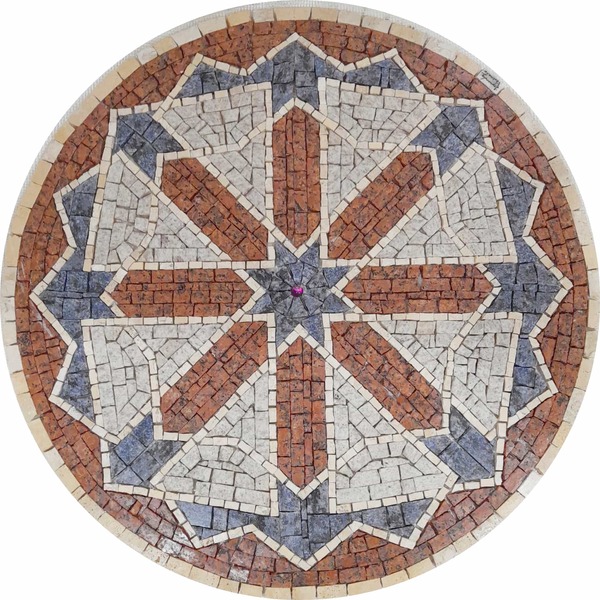 Piso mandala em mosaico feito com pedras a mandala simboliza a proteção da natureza em missões importantes destacando o equilíbrio entre forças opostas e a energia expansiva refletindo a luz do sol. pedras utilizadas: mármore italiano rosso verona granito vermelho br...