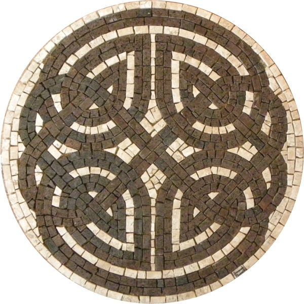 piso mandala em mosaico feito com pedras a trama celta é um clássico elemento decorativo da rica cultura celta. pedras utilizadas: travertino bege e granito marrom. os tons podem variar conforme o lote das pedras. significado da mandala: o nó celta é um símbolo de...