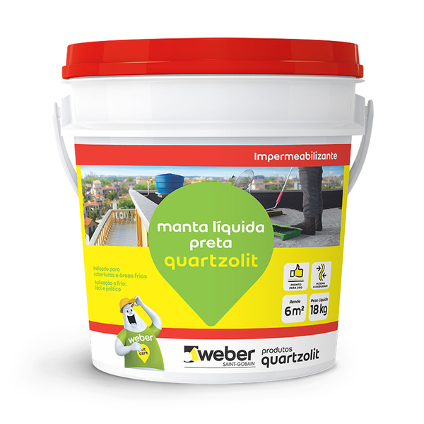 | Modo de Aplicação | Preparo do substrato: É essencial que manta líquida preta quartzolit seja aplicado sobre substrato íntegro, limpo e seco, com textura superficial uniforme. Quando necessário, realizar a regularização do substrato com argamassa de cimento e areia, na proporção de 1:3, respeitando a inclinação mínima de 1% em direção aos coletores de água. Todos os vértices vivos ou arestas devem ser arredondados. Remover a nata de cimento superficial por intermédio de jateamento abrasivo, seguido de lavagem com água. Aguardar a secagem do substrato e aplicar imprimação asfáltica com pintura asfáltica quartzolit. Aplicação: Após a secagem da imprimação, promover a aplicação de três demãos cruzadas de manta líquida preta quartzolit utilizando rolo de lã de carneiro, pincel ou trincha, respeitando-se o tempo de secagem entre uma demão e outra. Em situações de movimentação significativa dos elementos sob intervenção, recomenda-se instalar um estruturante de véu de fibra de vidro, tela de poliéster ou tela de nylon entre a segunda e a terceira demão. Ao redor de coletores de água, deve-se promover um rebaixo de 10 mm de profundidade e 50 cm de diâmetro. A impermeabilização deverá ultrapassar, no mínimo, 50 cm por baixo de batentes e contra-marcos. Para melhor impregnação do poliéster, a terceira demão deverá ser aplicada diluída em 10% de água. Aplique quantas demãos forem necessárias até se atingir o consumo indicado. Aguarde a cura do produto por, no mínimo, 5 dias antes do teste de estanqueidade. Produtos à base de asfalto, devem, necessariamente, ser recobertos por camada mecânica protetora, para evitar a degradação do polímero asfáltico e para atendimento à NBR 9.574. |