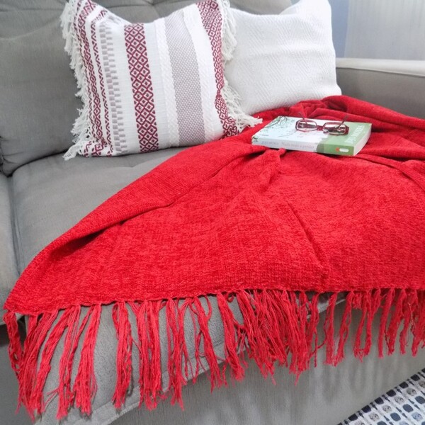 Manta para sofá vermelha em chenille a manta para sofá vermelha em chenille trará um diferencial para sua casa, deixando o ambiente mais sofisticado, acolhedor e perfeito para receber seus amigos e família. Confeccionada em tear mineiro, traz delicadeza ao trabalho e cores ex...