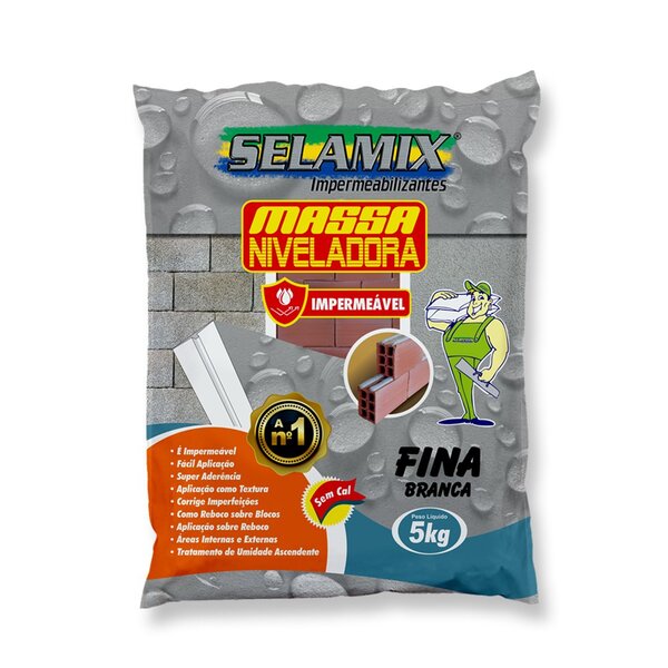 Características massa niveladora fina tem a finalidade de dar acabamento liso a massa niveladora média. Pode ser aplicada, também, sobre o reboco, corrigindo pequenas imperfeições na superfície, deixando a mesma polida, preparando a base para receber a camada de pintura. Produto inodoro, não tóxico, ótima aderência, formando uma camada impermeável, hidrorrepelente, resistente à alcalinidade, conferindo-lhe ótima durabilidade. Não possui cal em sua composição.