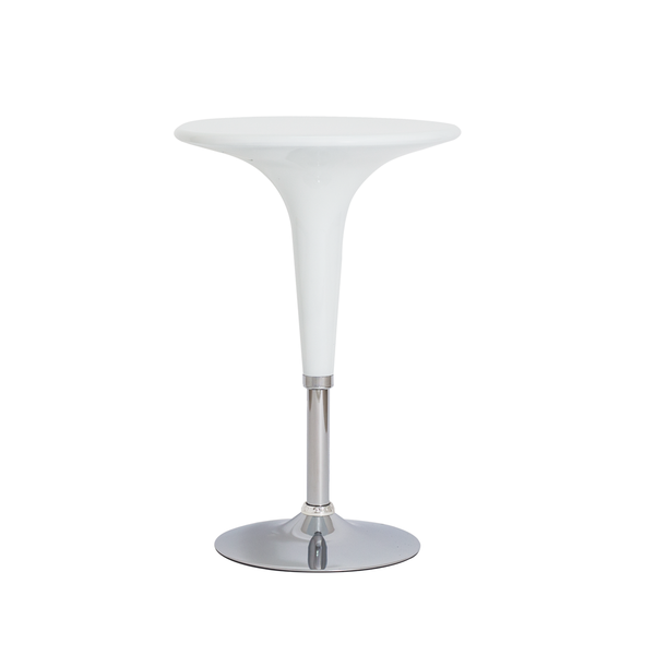 Modelo: Mesa Bombo Base Cromada Branca Tampo: ABS Base: Aço Cromado Diâmetro: 61 cm Altura Total: Alta 92 cm - Baixa 67 cm Quantidade por caixa: 2 Peso Unitário: 10 kgs Medida Embalagem Profundidade: 77 cm Largura: 73 cm Altura: 65 cm