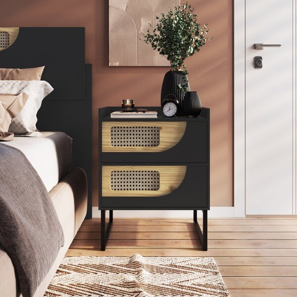 Mesa de cabeceira 2 gavetas apolo . A mesa de cabeceira apolo foi desenvolvida para você que busca um produto elegante e moderno, disposto de uma estrutura em mdf e mdp, perfeito para sua organização e otimização de espaço. O modelo possui 2 gavetas com corrediça telescópica, que possibilitam maior abertura, de modo que não danifique o móvel.  além disso, conta com 2 pés de ferro de 20cm cada, finalizados com pintura texturizada preta, que agregam beleza e sofisticação ao ambiente.  estilo: clássico peso (kg): 18 garantia: 06 meses altura (cm): 69 largura (cm): 55 possui pés: sim pet friendly: não possui vidro: não possui nichos: não possui portas: não altura dos pés: 20 pés reguláveis: não possui rodízio: não suporta até (kg): 5 profundidade (cm): 45 material dos pés: metal serviço montagem: 114259443 origem do produto: nacional ambiente principal: quarto material da gaveta: mdf material principal: mdp sapatas niveladoras: não peso máximo por gaveta: 5 tipo de puxador da gaveta: externo tipo de corrediça da gaveta: metálica telescópica material do puxador da gaveta: madeira maciça tipo de madeira maciça do puxador da porta: pinus fabricante: edez marca: edez cor: preto ônix quantidade de gavetas: 02 gavetas
