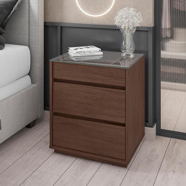 A mesa de cabeceira e ideal para seu dormitório. Tampo feito de vidro, base e laterais feitos em mdp de 25mm, e possui 3 travessas transversais em mdp de 15mm que garante maior estabilidade e resistência à estrutura. Possui 3 gavetas sendo que a superior possui um organizador...
