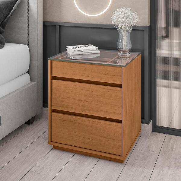 A mesa de cabeceira e ideal para seu dormitório. Tampo feito de vidro, base e laterais feitos em mdp de 25mm, e possui 3 travessas transversais em mdp de 15mm que garante maior estabilidade e resistência à estrutura. Possui 3 gavetas sendo que a superior possui um organizador...