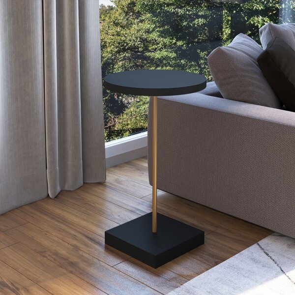 Mesa lateral redonda 35cm nero/dourado. Mesa lateral confeccionada em mdp com acabamento em bp, tampo de espessura 25mm e base de 40mm, estrutura metálica em aço carbono de tubo redondo com acabamento em pintura epóxi fosco, materiais que trazem resistência e durabilidade ao ...