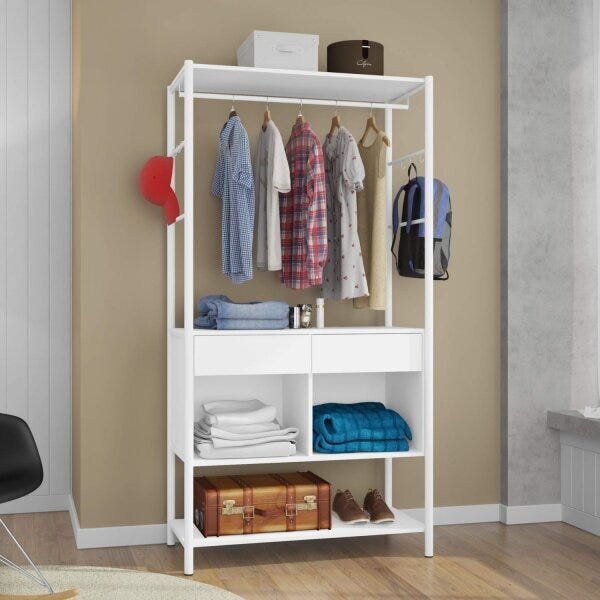 Módulo closet paris . Novo conceito em roupeiro, prático e moderno. Utiliza menos espaço no ambiente, com ganchos porta objetos, prático no armazenamento de materiais. Produto em aço carbono, com tratamento de fosfatização, garantindo mais resistência a oxidação, possibilitando 100% da fixação da pintura. Pintura eletrostática a pó. Madeiramento em mdp com revestimento em bp 15mm.! Estilo: moderno garantia: 03 meses altura (cm): 187 largura (cm): 90 peso total: 30.98 possui pés: sim possui portas: não altura dos pés: 5 possui gavetas: sim suporta até (kg): 10 profundidade (cm): 47 escala de brilho: semi-fosco gaveta com chave: não material dos pés: aço possui calceiros: não serviço montagem: 114259443 origem do produto: nacional possui cabideiros: sim ambiente principal: quarto material da gaveta: mdp material principal: mdp possui prateleiras: sim acabamento da gaveta: bp material da prateleira: mdp peso máximo por gaveta: 10 acabamento da prateleira: bp peso máximo por prateleira: 15 tipo de corrediça da gaveta: metálica simples fabricante: artefamol marca: artefamol cor: branco itens inclusos: 1 módulo closet, kit ferragens e manual de montagem cor predominante: branco linha ou coleção: moderno/industrial quantidade de cabideiros: 01 cabideiro quantidade de prateleiras: 03 prateleiras quantidade de portas: 2 portas quantidade de gavetas: 02 gavetas