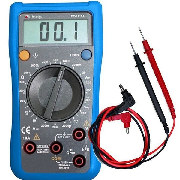 Multímetro de baixo custo e dimensões reduzidas com diversos recursos para aplicações em ambientes monofásicos, bancadas, hobby.Faz medições de tensão DC e AC, corrente DC, resistência,  temperatura,  Alerta de continuidade,  diodo, transistor e a função Data Hold, que congela a leitura no display.