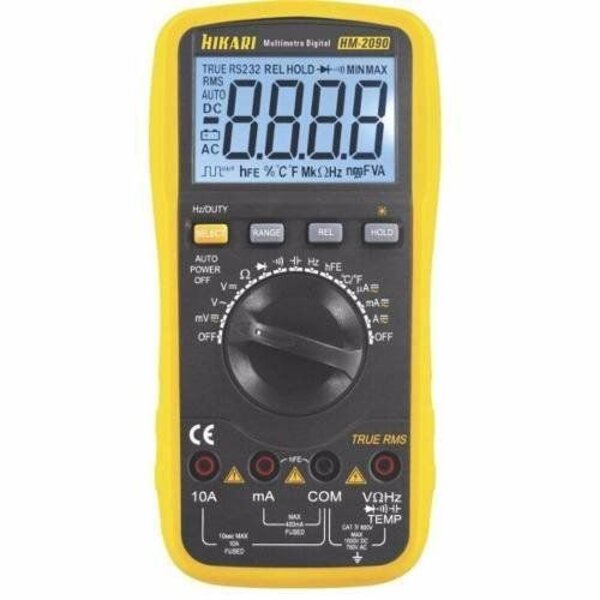 Instrumento digital portátil TRUE RMS, com LCD de 3 ¾ dígitos com iluminação, de acordo com a categoria IV 600V de segurança, holster protetor, congelamento de leitura, modo relativo, desligamento automático e mudança de faixa automática. Realiza medidas de tensão DC e AC, corrente DC e AC, resistência, capacitância, freqüência, duty cycle, temperatura e testes de diodo e continuidade.