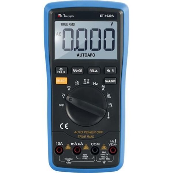Aplicações diferencia-se por ser pequeno portátil true rms auto range e possuir display de 3 5/6 dígitos com uma estrutura original altamente confiável e segura assim como um display grande com luz de fundo. O instrumento pode ser usado em medidas de tensão ac/dc corrente ac/dc resistência diodo continuidade capacitância temperatura e frequência. É o instrumento portátil ideal para manutenção. segurança este instrumento está de acordo com os padrões iec61010: categoria de sobretensão cat iii 600v com dupla isolação. Como determinado pela norma de segurança nr-10 utilize sempre instrumentos de proteção individual. geral a precisão é dado por ±(% leitura + número de dígitos) ou especificado de outra maneira para 23°c±5°c e umidade relativa características • display lcd com iluminação: 3 5 / 6 dígitos 6.000 contagens; • taxa de atualização: aproximadamente 3 vezes por segundo; • indicação de sobrefaixa: “ol”; • indicação de polaridade: automática; • indicação de bateria fraca: “ + ”; • desligamento automático: aproximadamente 15 minutos; • true rms ac; • mudança de faixa: automática/manual; • data hold; • função max./mín.; • função relativo (rel); • duty cycle • altitude de operação: até 2.000 metros; • ambiente de operação: 0°c~40°c u.r. • ambiente de armazenamento: -10°c ~ 50°c u.r. • segurança/conformidade: iec61010 categoria de sobretensão cat iii 600v com dupla isolação; • alimentação: 1 x 9v (neda 1604 / 6f22 ou equivalente); • dimensão: 184(a) x 90(l) x 46(p)mm; • peso: aproximadamente 350 gramas (incluindo bateria); • proteção: fusível de 600ma/250v para borne ‘ma’; fusível de ação rápida 10a/250v para borne ‘10a’. acessórios 1. Manual de instruções (1 un.) 2. Pontas de prova (1 par) 3. Sensor de temperatura tipo k (1 un.) tensão dc • faixas: 60mv 600mv 6v 60v 600v 1000v; • precisão: 60mv ~ 600v ±(0 5%+3d) 1000v ±(0 8%+10d); • resolução: 0 01mv 0 1mv 0 001v 0 01v 0 1v 1v; • impedância de entrada: 10mw (haverá uma instabilidade no display no caso das faixas de mv); • proteção de sobrecarga: 550v dc/ pico ac para faixa de 200mv e 1000v dc ou 750v pico ac para demais faixas. tensão ac • faixas: 60mv 600mv 6v 60v 600v 750v; • precisão: 60mv ~ 200v ±(0 8%+5d) 750v ±(1 2%+10d); • resolução: 0 01mv 0 1mv 0 001v 0 01v 0 1v 1v; • impedância de entrada: aprox. 10mw; • proteção de sobrecarga: 550v dc/ pico ac para faixa de 200mv 1000v dc ou 750v pico ac para demais faixas; • frequência de resposta: frequência de resposta: 45 ~ 1khz para ondas senoidal e triangulares 40 ~ 200hz para outros tipos de ondas. corrente dc • faixas: 600µa 6000µa 60ma 600ma 6a 10a; • precisão: 600µa ~ 6000µa ±(0 8%+10d) 60ma ~ 10a ±(2 0% + 30d); • resolução: resolução: 0 1µa 1µa 0 01ma 0 1ma 0 001a 0 01a; • proteção de sobrecarga fusível de 600ma/250v para borne ‘ma’; fusível de ação rápida 10a/250v para borne ‘10a’. corrente ac • faixas: 600µa 6000µa 60ma 600ma 6a 10a; • precisão: 600µa ~ 6000µa ±(0 8%+10d) 60ma ~ 10a ±(2 0% + 30d); • resolução: 0 1µa 1µa 0 01ma 0 1ma 0 001a 0 01a; • proteção de sobrecarga fusível de 600ma/250v para borne ‘ma’; fusível de ação rápida 10a/250v para borne ‘10a’. • frequência de resposta: 45 ~ 1khz para ondas senoidal e triangulares 40 ~ 200hz para outros tipos de ondas; • exibe o valor em true rms. resistência • faixas: 600w 6kw 60kw 600kw 6mw 60mw. • precisão: 600w ±(0 8%+5d). 6kw ~ 6mw ±(0 8%+3d). 20mw ±(2 0%+25d). • resolução: 0 1w 0 001kw 0 01kw 0 1kw 0 001mw 0 01mw. • valor medido = valor exibido - valor de curto- -circuito das pontas de prova. • tensão em aberto: • quando a medida é acima de 1mw aguardar alguns segundos até estabilizar a leitura. • proteção de sobrecarga: 550v dc ou valor de pico ac. capacitância • faixas: 100nf 1000nf 10µf 100µf 1000µf 10mf; • precisão: 100nf ~ 100µf ±(3 5%+20d) 1000µf ~ 10mf ±(2 0% + 30d); • resolução: 0 001nf 0 01nf 0 1nf 0 001µf 0 01µf 0 1µf 0 001mf; • proteção de sobrecarga: 550v dc ou valor de pico ac. • para capacitância ≤1000nf é recomendado o uso da função rel para assegurar a precisão da medida. frequência / duty cycle • faixas: 10hz 100hz 1000hz 10khz 100khz 1000khz 10mhz 20mhz; • precisão: ± (0 1%+3d); • resolução: 0 001hz 0 01hz 0 1hz 0 001khz 0 01khz 0 1khz 0 001mhz 0 01mhz; • sensibilidade de entrada: 1v rms; • proteção de sobrecarga: 550v dc ou valor de pico ac. teste de continuidade • faixa: • acima de 50±20 ω o alarme sonoro não é ativado. O alarme sonoro é ativado quando o objeto medido está com boa condutividade • proteção de sobrecarga: 550v dc ou valor de pico ac. teste de diodo • faixa: • tensão de circuito aberto por volta de 3v. O valor de tensão de uma junção pn de silício costuma ser por volta de 0 5 ~ 0 8v. • proteção de sobrecarga: 550v dc ou valor de pico ac. temperatura • faixas: -20°c ~ 1000°c 0°f ~ 1832°f • precisão: -20°c ~ 400°c ±(1 0%+5d) 400°c ~ 1000°c ±(1 5%+1 5d) 0°f ~ 750°f ±(0 75%+5d) 750°f ~ 1832°f ±(1 5%+1 5d); • resolução: 1°c 1°f;