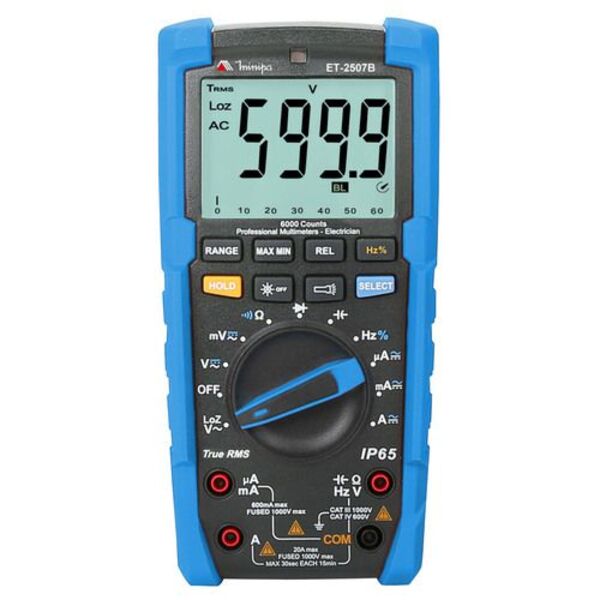 Aplicações o multímetro digital et-2507b - minipa diferencia-se por ser pequeno portátil true rms auto range e possuir display grande de 3 5 / 6 dígitos com uma estrutura original altamente confiável e segura. Conta com proteção contra poeira e água ip65. O instrumento pode ser usado em medidas de tensão ac/dc corrente ac/dc resistência diodo continuidade capacitância e frequência. É o instrumento portátil ideal para manutenção em indústrias petrolíferas químicas automobilísticas etc. este instrumento está de acordo com o padrão iec60529 ip65 grau de poluição 2 e iec61010-1 categoria de sobretensão cat iv 600v e dupla isolação. características • display: lcd 6000 contagens com 9999 para frequência e 4000 para capacitância. • indicação de sobre faixa: ol. • taxa de atualização: 3 vezes por segundo. • mudança de faixa: manual e automática. • indicação de polaridade: automática. • indicador de bateria fraca: o símbolo de uma bateria aparecerá no display • proteção por fusível para o terminal de entrada maμa: fusível de 0 6a/1000v φ6x32mm ação rápida. • proteção por fusível para o terminal de entrada 20a: fusível de 11a/1000v φ10x38mm ação rápida. • temperatura: operação: 0°c ~ 40°c (32°f a 104°f). armazenamento: -10°c a 50°c (14°f a 122°f). • umidade relativa: ≤75% @ 0°c a 30°c ≤50% @ 31°c a 40°c • altitude de operação: abaixo de 2000m. • tipo de bateria: 9v 6f22. • compatibilidade eletromagnética: em um campo de rádiofrequência (rf) • segurança/conformidade: iec61010 sobretensão e dupla isolação cat iv 600v cat iii 1000v. • grau de poluição: 2. • dimensões: 195(a) x 95(l) x 58(p)mm. • peso: aproximadamente 473g (incluindo bateria). • garantia: 12 meses acessórios 1. Manual de instruções 2. Pontas de prova 3. Bolsa para transporte tensão dc • faixas: 600mv 6v 60v 600v 1000v. • precisão: 600mv ±(0 7%+3d). 6v ±(0 5%+3d). 60v ~ 1000v ±(0 7%+3d). • resolução: 0.1mv 0.001v 0.01v 0.1v 1v. • impedância de entrada: 10mω. • máxima tensão de entrada: 1000v dc. tensão ac (true rms) • faixa: 600mv 6v 60v 600v 750v acloz 600.0v • resolução: 0.1mv 0.001v 0.01v 0.1v 1v • precisão: 600mv ±(1 0%leit.+4d) 6v ±(0 7%leit.+3d) 60v ~ 750v ±(1 0%leit.+3d) ac loz 600 0v ±(2 0%leit.+3d) • tempo de estabilização na função loz: 1 minuto. • impedância de entrada: loz 300kω demais entradas aprox. 10mω. • máxima tensão de entrada: 750vac rms. • frequência de resposta: 45 ~ 400hz. • valores true rms são aplicáveis de 5% a 100% da faixa com uma leitura residual de curto-circuito permitida de • o fator de crista em ac pode ser de até 3 0 exceto em 750v onde pode ser até 1 5. corrente dc (true rms) • faixa: 600µa 6000µa 60ma 600ma 6a 20a • resolução: 0.1µa 1µa 0.01ma 0.1ma 0.001a 0.01a • precisão: 600µa ~ 600ma ±(1%leit.+3d) 6a ±(1 2%leit.+3d) 20a ±(1 5%leit.+5d) • proteção de sobrecarga entrada para ma: fusível 0 6a/1000v φ6x32mm. entrada para 20a: fusível 11a/1000v φ10x38mm. • frequência de resposta: 45 ~ 400hz. • exibe o valor em true rms. • valores true rms são aplicáveis de 5% a 100% da faixa com uma leitura residual de curto-circuito permitida de • o fator de crista em ac pode ser de até 3 0. • medição de corrente de 10~20a ac/dc devem ser feitas em até 30 segundos para ser feito uma nova medição é recomendável esperar 15 minutos de intervalo. resistência • faixa: 600ω 6kω 60kω 600kω 6mω 60mω • resolução: 0.1ω 1ω 10ω 100ω 1kω 10kω • precisão: 600ω ±(1%leit.+2d) 6kω ~ 600kω ±(0 8%leit.+2d) 6mω ±(1 2%leit.+3d) 60mω ±(2 5%leit.+5d) • proteção de sobrecarga: 1000v. • valor medido = valor exibido - valor de curto-circuito das pontas de prova capacitância • faixas: 6nf 60nf 600uf 6mf 60mf • precisão: 6nf ±(4%+10d). 60nf ~ 600uf ±(3%+5d). 6mf ~ 60mf ±(10%). • resolução: 1pf 10pf ~ 0.1uf 1uf ~ 10uf. • proteção de sobrecarga: 1000v. frequência/duty cycle • faixas: 60 hz ~ 10mhz / 0 1% ~ 99 9% • precisão: frequência: ±(0 1%+4d). duty cycle: ±(2 0%+5d). • resolução: 0 01hz ~ 0 01mhz / 0 1%. • amplitude de entrada: (nível dc é zero) ≤100khz: 200mvrms ≤ a ≤ 30vrms >100khz ~ 1mhz: 600mvrms ≤ a ≤ 30vrms >1mhz ~ 10mhz: 1vrms ≤ a ≤ 30vrms >10mhz: 1 8vrms ≤ a ≤ 30vrms • duty cycle: aplicável apenas para medidas ≤ 10khz. • proteção de sobrecarga: 1000v • sensibilidade de entrada: > 2vpp • resposta em frequência: ≤ 1khz / duty cycle: 10% ~ 95% • resposta em frequência: > 1khz / duty cycle: 30% ~ 70% teste de diodo • resolução: 1mv. • tensão de circuito aberto por volta de 3 5v. O valor de queda de tensão de uma junção pn de silício costuma ser por volta de 0 5 ~ 0 8v. • proteção de sobrecarga: 1000v. teste de continuidade • resolução: 0 1ω. • acima de 50ω o alarme sonoro não é ativado. O alarme sonoro é ativado quando o objeto medido está com boa condutividade (resistência ≤10ω). • proteção de sobrecarga: 1000v.