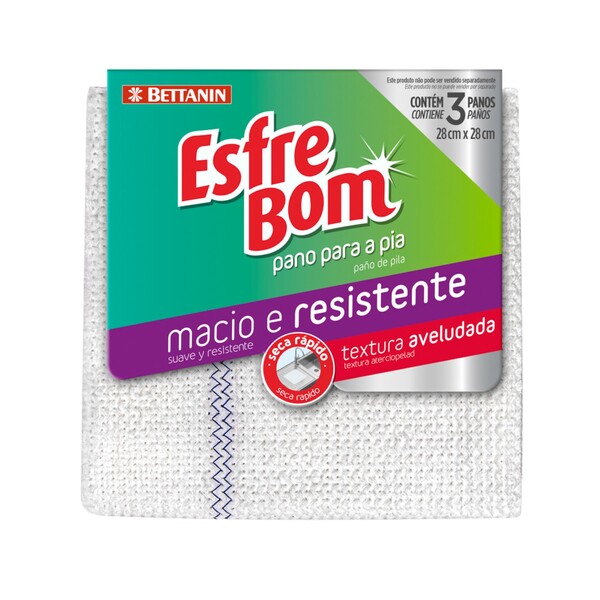 A embalagem do Pano para Secar Pias Esfrebom contém 3 unidades, garantindo um excelente custo-benefício e praticidade para o seu dia a dia.
