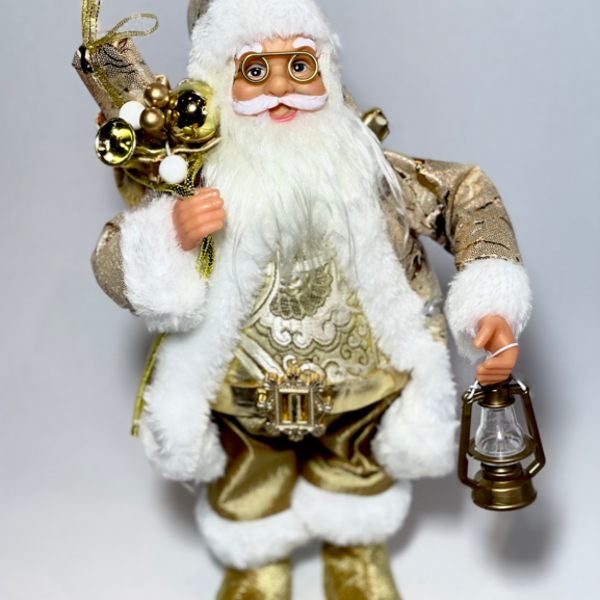 Papai noel em pé dourado 30cm - papai noel ira dar um toque especial de sofisticação em sua decoração , com detalhes singulares e sutis, espalhando charme e delicadeza por seu lar. detalhes do produto: material: tecido medidas do produto: altura:30 cm largura: 14 cm co...